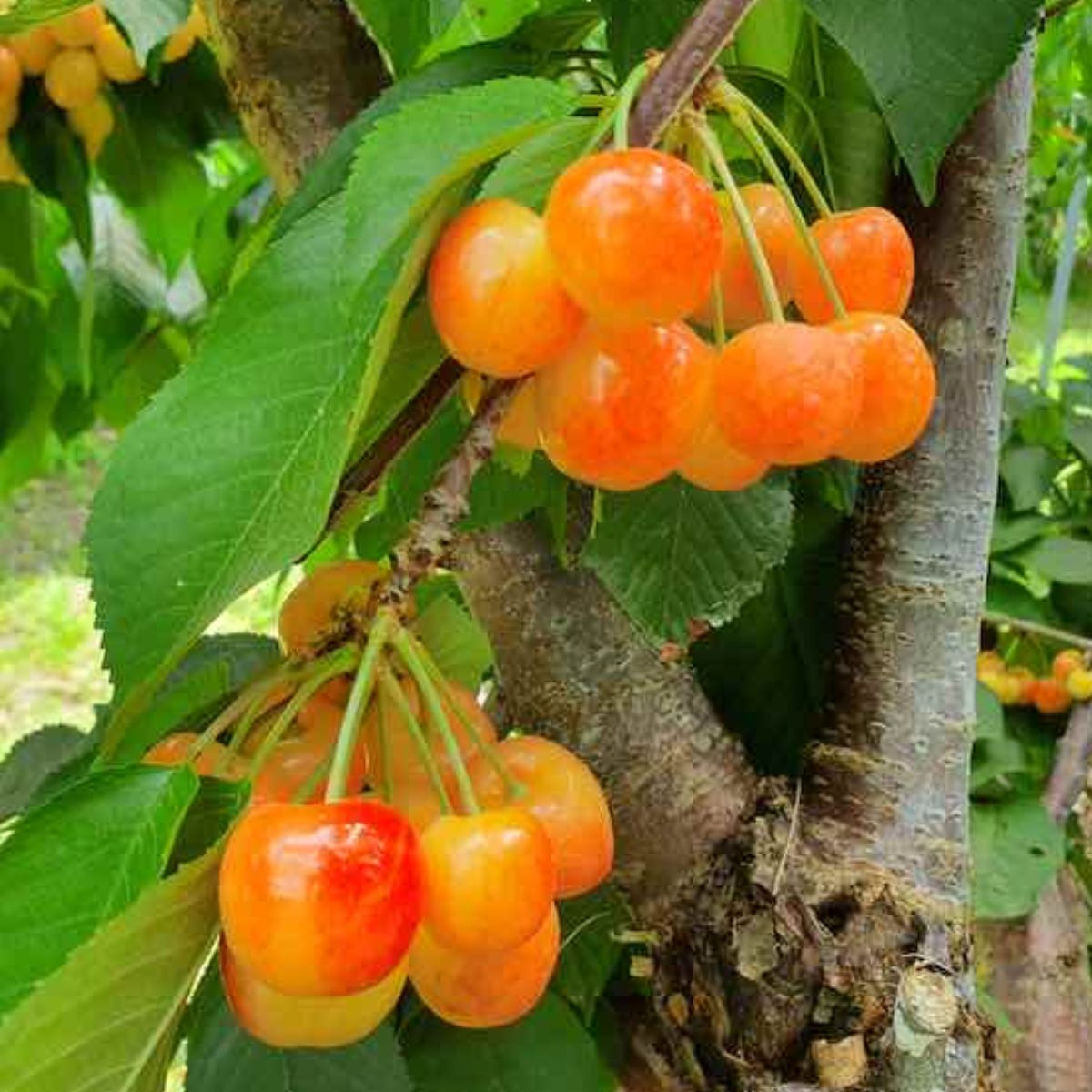 Die Süßkirsche „Rainier” kommt relativ schnell in die Fruchtphase – die ersten Früchte erscheinen in der Regel bereits 3–4 Jahre nach der Pflanzung. Die Früchte sind groß, mit einem durchschnittlichen Gewicht von 7–9 g, und haben eine herzförmige oder leicht abgeflachte Form. Die Schale ist gelb und teilweise von einem zarten roten Schimmer überzogen. Dadurch erhalten die Früchte bei voller Reife ein subtiles, zweifarbiges Aussehen und sehen äußerst beeindruckend aus. Das Fruchtfleisch ist cremig-gelb, sehr saftig und bleibt lange fest. Der Geschmack der Früchte wird von den Verbrauchern sehr geschätzt – süß, mit einer zarten, erfrischenden Säurenote. Die Süßkirsche „Rainier” reift Mitte Juli. Die Früchte sind vielseitig verwendbar, werden jedoch meist frisch verzehrt. Ein weiterer Vorteil dieser Sorte ist ihre hohe Widerstandsfähigkeit gegen das Aufplatzen der Früchte, selbst bei starken Regenfällen.