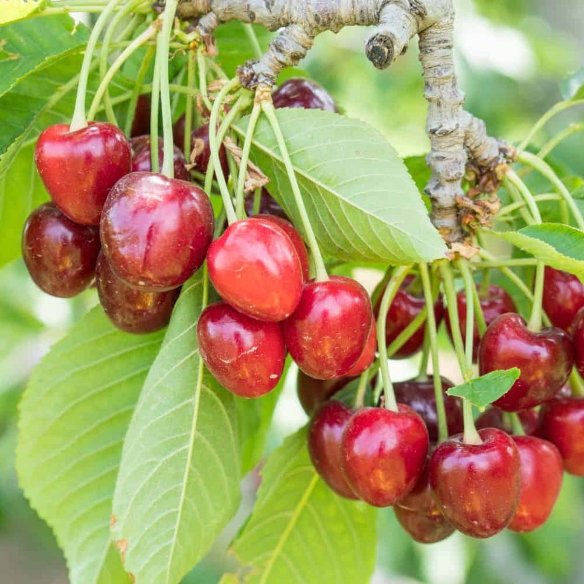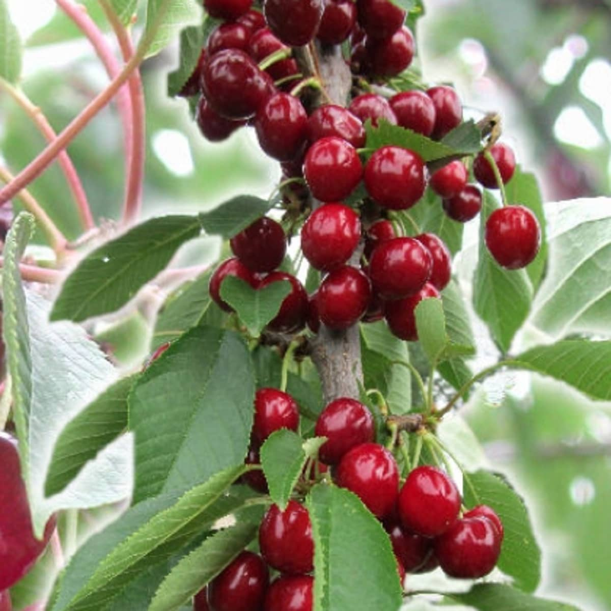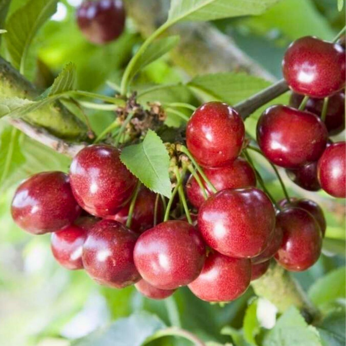 Die Früchte von ‘Celesta’ erfüllen die Erwartungen an eine moderne Dessert-Süßkirsche: groß, glänzend, fest und süß. Meist kugelig bis breit herzförmig, färben sie sich bei voller Sonne von Rot zu Dunkelrot/Bordeaux aus und zeigen damit die klassische „Kirschpräsenz“ am Baum und in der Kiste. Das Fruchtfleisch bleibt knackig-fest, saftig, mit klarem Dessertcharakter und sanfter Säure; der Kern ist mittelgroß und bei Pflückreife gut löslich. Gern hervorgehoben wird die geringe Aufplatzneigung — bei wechselhaftem Wetter in der Reifephase verkraften die Früchte Regenperioden oft besser als viele klassische Sorten. Zudem ist die Haltbarkeit nach der Ernte gut: Die Qualität bleibt stabil, Umlagerungen und kurze Transporte werden ordentlich vertragen. In Mitteleuropa liegt die Erntezeit gewöhnlich zwischen der zweiten Junihälfte und Juli (im Kübel oder an Südwänden teils früher). Die Säulenform begünstigt ein gleichmäßiges Ausreifen, sodass ein bis zwei kompakte Erntetermine häufig genügen. ‘Celesta’ trägt regelmäßig und kann bei kontrollierter Höhe selbst auf kleiner Fläche reichlich fruchten.