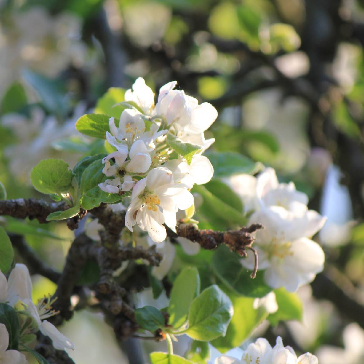 Die Blüte erfolgt im mittleren Zeitraum — in der Regel von Ende April bis in die ersten Maitage — und fällt durch große, schneeweiße Blüten auf, deren Knospen zart rosé getönt sind. In Vollblüte wirken die Zweige wie mit einer leichten Wolke überzogen, der honigartige Duft lockt Bienen und Hummeln zuverlässig an. Die Sorte ist selbststeril und benötigt Apfelbäume mit ähnlicher Blütezeit in der Nähe. Sehr gut kompatibel sind u. a. ‘Freedom’, ‘Golden Delicious’, ‘Idared’, ‘Cortland’ und ‘Gala’. In der Praxis genügt schon eine passende Sorte in der Nachbarschaft, um einen reichen, homogenen Fruchtansatz zu sichern.