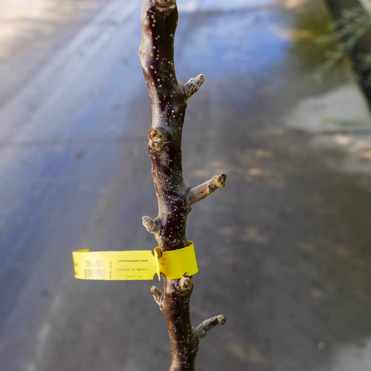 Der Apfelbaum Gin wächst mäßig stark und behält dabei einen klaren Säulencharakter. Er besitzt einen kräftigen, geraden Leittrieb, um den sich zahlreiche kurze, fruchttragende Triebe anordnen. Er erreicht meist etwa 3 Meter Höhe und bleibt unter 80 Zentimeter breit. Die Blätter sind groß, gesund und intensiv grün, was dem Baum ein gepflegtes, harmonisches Erscheinungsbild verleiht. Durch die kompakte und aufrechte Form lässt sich der Baum auch in Reihen pflanzen, wodurch er sowohl als fruchttragende Hecke als auch als dekoratives Gestaltungselement genutzt werden kann. Das dichte Laub sorgt für gute Belüftung und gleichmäßige Belichtung, was die Fruchtqualität deutlich verbessert. Gin trägt früh — meist schon im zweiten Jahr nach der Pflanzung. Dank des säulenförmigen Aufbaus sind Pflege und Ernte einfach und bequem, auch ohne Leiter.