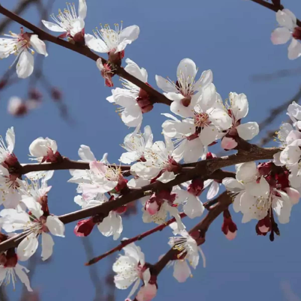 Der Aprikosenbaum Somo blüht mittelfrüh, meist in der zweiten Aprilhälfte, wenn der Garten gerade zu neuem Leben erwacht. In dieser Zeit ist die Krone dicht mit zarten, schneeweißen Blüten mit einem Hauch von Rosa in den Knospen bedeckt. Sie bilden eine duftende, leichte Blütenwolke, die dem Baum einen romantischen, frühlingshaften Charakter verleiht. Der sanfte Duft zieht Bienen und Hummeln an und macht Somo zu einem echten Blickfang im Garten.