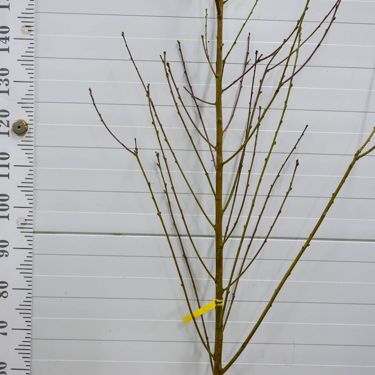 Der Baum wächst mittelstark und bildet eine breite, gut verzweigte Krone mit harmonischer Struktur. Er erreicht etwa 3,5–4 Meter Höhe, was Pflege und Ernte erleichtert. Die Äste sind kräftig und elastisch, sodass Licht gleichmäßig in die Krone fällt und die Früchte gleichmäßig reifen. Die Blätter sind lang, lanzettlich, dunkelgrün und glänzend – sie verleihen dem Baum eine elegante, dekorative Wirkung. Red Glory lässt sich gut formen und reagiert positiv auf den jährlichen Schnitt. Er trägt früh – erste Früchte erscheinen oft schon im zweiten oder dritten Jahr nach der Pflanzung.