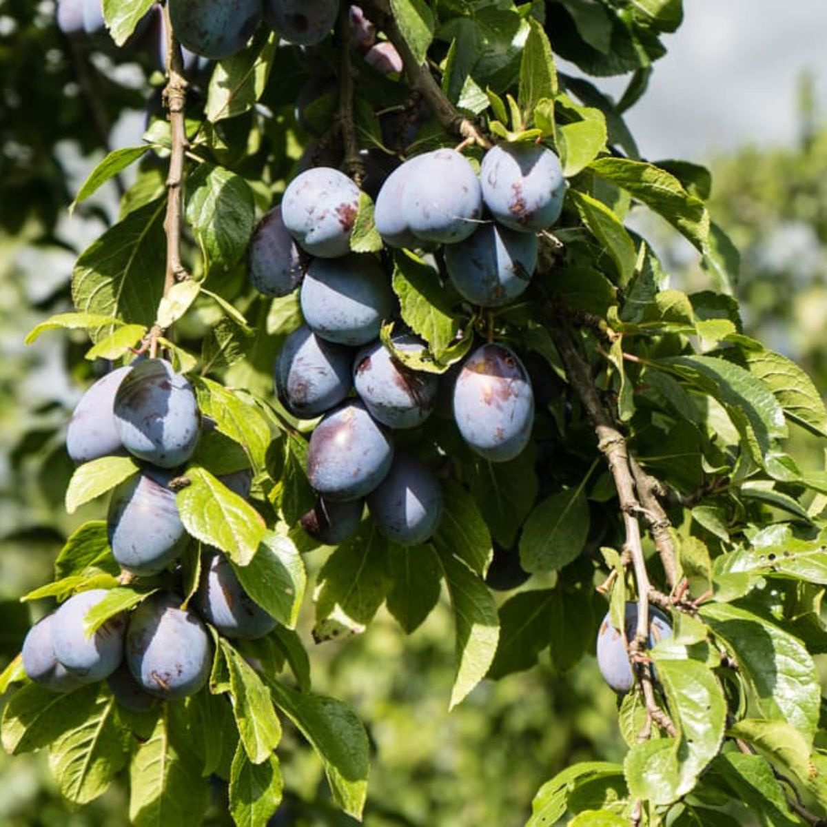 Die Früchte des Pflaumenbaum Teemano gehören zu den attraktivsten ihrer Klasse. Sie sind groß (45–50 g), oval bis leicht länglich und besitzen eine glatte, tiefviolette Schale mit einem feinen, bläulichen Wachsüberzug, der ihnen einen eleganten Glanz verleiht. Das Fruchtfleisch ist goldgelb, saftig, fest und elastisch – der Stein löst sich leicht. Der Geschmack ist intensiv süß mit einer feinen, erfrischenden Säure, was ihm eine harmonische Balance verleiht. Die Früchte reifen in der zweiten Augusthälfte, sind platzfest, transportfähig und bleiben nach der Ernte lange haltbar. Sie eignen sich sowohl zum Frischverzehr als auch für Konfitüren, Kompotte oder Trockenfrüchte, wobei sie Farbe, Aroma und Struktur sehr gut bewahren.